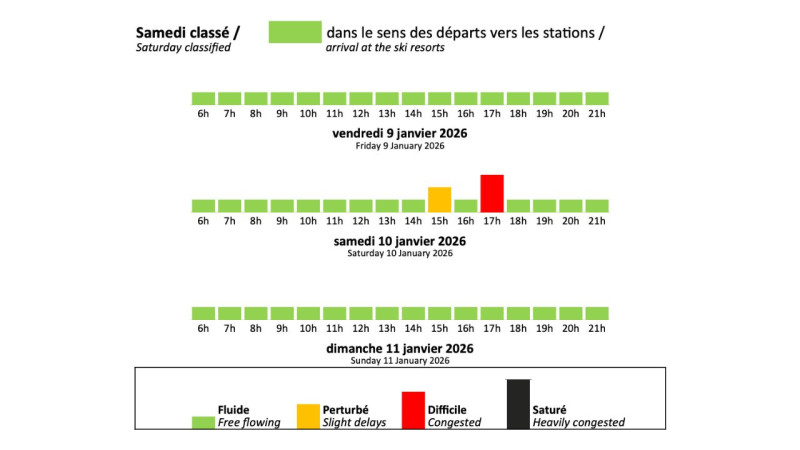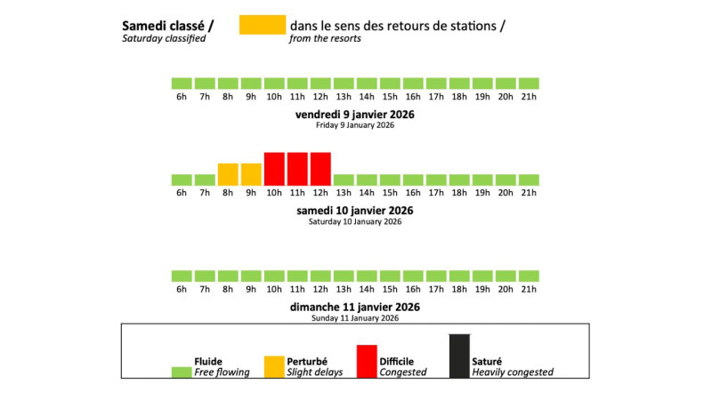 La Direction Interdépartementale des Routes Centre-Est et le Conseil Départemental de la Savoie informent des prévisions de trafic pour le week-end du vendredi 9 janvier 2026 au dimanche 11 janvier 2026.