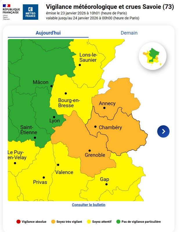Les départements de la Savoie, de la Haute-Savoie et de l’Isère sont placés en vigilance orange neige-verglas à partir de ce vendredi à 18h. Un épisode neigeux bref mais intense est attendu en fin de journée, avec des difficultés possibles pour les déplacements, notamment dans les vallées.