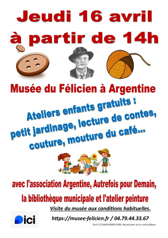Le musée du Félicien et l’association Argentine, Autrefois pour Demain en partenariat avec la bibliothèque municipale d’Argentine et l'atelier peinture vous proposent des ateliers pour enfants gratuits le jeudi 16 avril à partir de 14h.