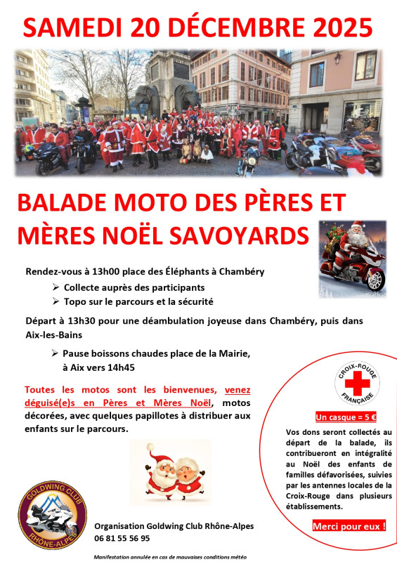 Pour la 8ème année consécutive, le Goldwing Club Rhône-Alpes organise et coordonne la balade des Pères et Mères Noël entre Chambéry et Aix-les-Bains, en partenariat avec les antennes locales de la Croix-Rouge, le samedi 20 décembre.