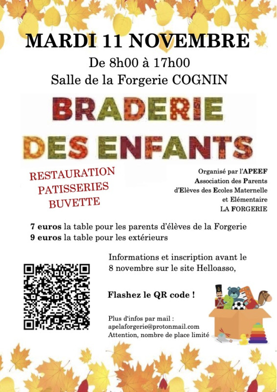 Réservation de table pour les exposants : 9 euros la table. Réservation avant le 8 novembre en ligne sur : https://www.helloasso.com/associations/association-des-parents-d-eleve-de-la-forgerie/evenements/braderie-du-11-novembre