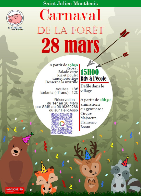 L'association La tirelire des écoles vous invite au Carnaval de la Forêt le samedi 28 mars, avec défilé de chars dans les rues de Saint Julien Montdenis, animations au gymanse, repas et soirée dansante ! Rendez-vous le samedi 28 mars à 15h30 devant le groupe scolaire de Saint Julien Montdenis avec votre plus beau costume d'ours, de renard et de chouette !