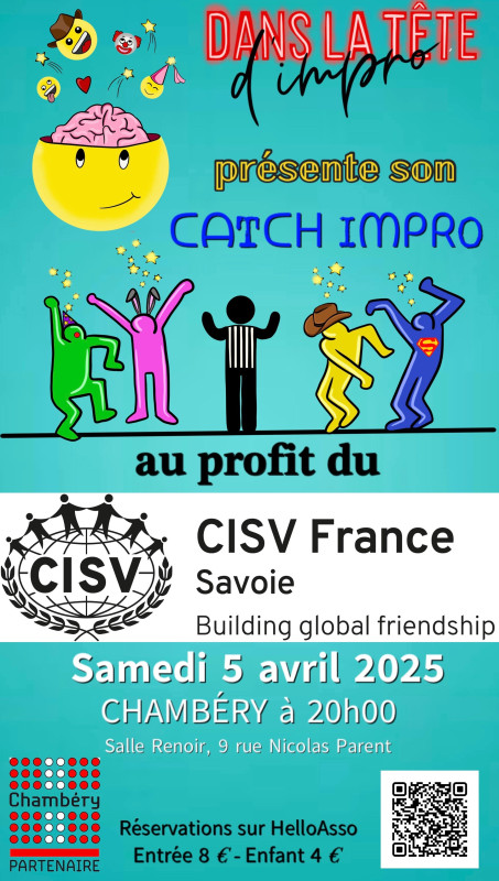 si on prenait le temps de s'évader? 2 équipes de 2 joueurs, un arbitre, des thèmes délirants, et des milliers de possibilités d'improvisations ! Venez retrouver la troupe "Dans la tête d'impro" pour son catch improvisé au bénéficie du CISV SAVOIE MONT BLANC, qui organise des rencontres interculturelles et internationales de jeune pour un monde meilleur. Laissez vous porter pour une soirée hors du temps: du rêve, des émotions, des voyages dans d'autres mondes... Venez rire pour la bonne cause