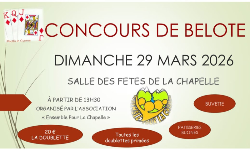 Bonjour, concours de belote proposê par Ensemble Pour La Chapelle, association pour la prêservation du patrimoine. Inscription à partir de 13h30, jeu à 14h00.
