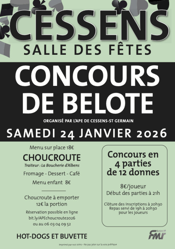 Concours de belote (en 4 parties de 12 donnes) ayant lieu le samedi 24 janvier prochain à la salle des fêtes de Cessens.