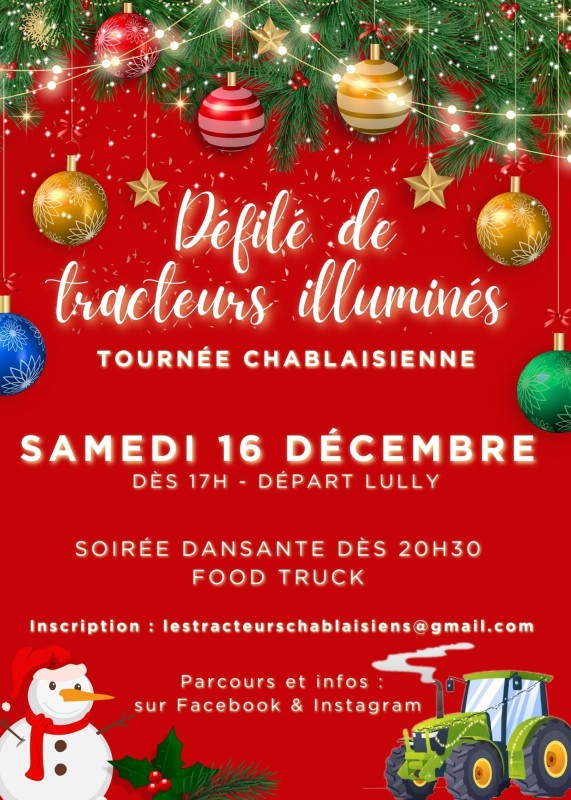 Les tracteurs Chablaisiens organise leurs premier défilé de tracteurs illuminés sur les routes du chablais, avec un départ à 17h à Lully, puis une soirée dansante à la salle des fêtes de Lully, avec 2 foods trucs sur place, retrouvez le parcours et les dossiers d'inscriptions sur Facebook et Insta "Les tracteurs Chablaisiens" une partie des bénéfices sera reversé à l'association Solidarité paysans des Pays de Savoie