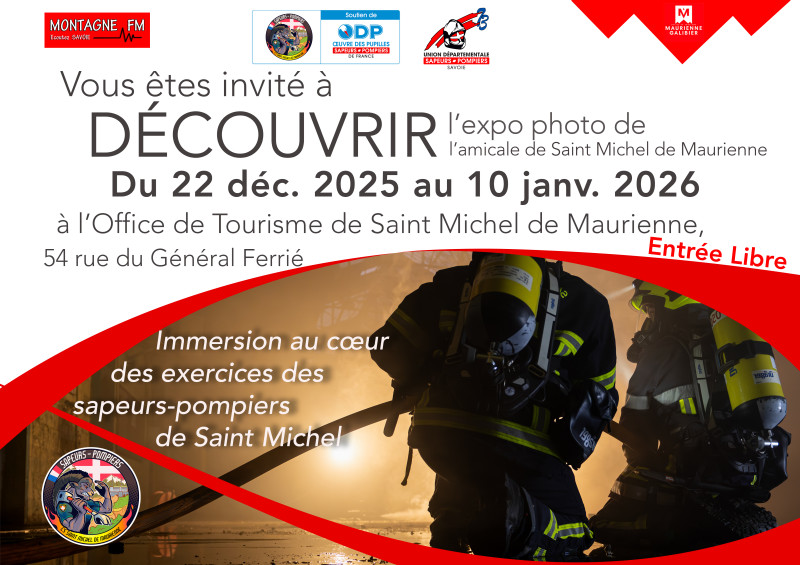 À Saint-Michel-de-Maurienne, en Savoie (73), l'amicale des sapeurs-pompiers organise sa première exposition de photographies, intitulée Immersion au cœur des exercices des sapeurs-pompiers de Saint-Michel-de-Maurienne. Du 22 décembre 2025 au 10 janvier 2026, 20 photographies de 100x60cm sont exposées à l'Office du Tourisme Maurienne Galibier. Le vernissage a lieu le lundi 22 décembre à 17 h 45.