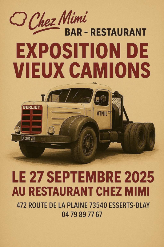 Exposition vieux camions. Buvette extérieure, concert de 13h30 a 15h30. Restauration sur place. Bonne journée et bonne humeur assurée
