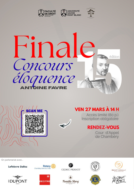 La finale se déroule dans un cadre particulièrement symbolique : la Cour d’appel de Chambéry. Quatre finalistes s’y affrontent sous forme de joutes oratoires : deux sujets sont proposés, chacun étant défendu « pour » et « contre » par les candidats, permettant ainsi un véritable débat d’idées. Cette année, les finalistes sont Camille Dusseaux, Louane Vacchiani, Maxime Rudaz et Léonie IUND. Et les sujets sont :