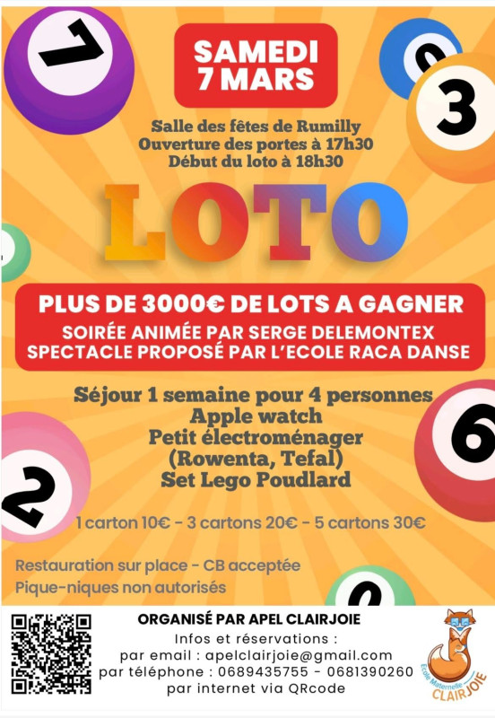 Le loto organisé par l’APEL Clairjoie, pour les enfants de notre petite ecole maternelle qui aura lieu le 7 mars à la salle des fêtes de Rumilly.