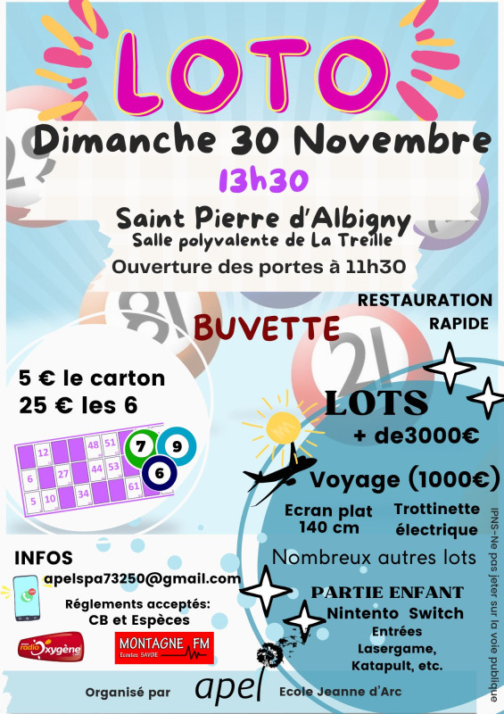 L’Association des Parents d’Élèves de l’École Jeanne d’Arc (Saint-Pierre d’Albigny) organise son grand loto annuel le dimanche 30 novembre 2025, à la salle de la Treille. Cet événement convivial a pour but de financer les projets éducatifs et culturels de nos élèves.