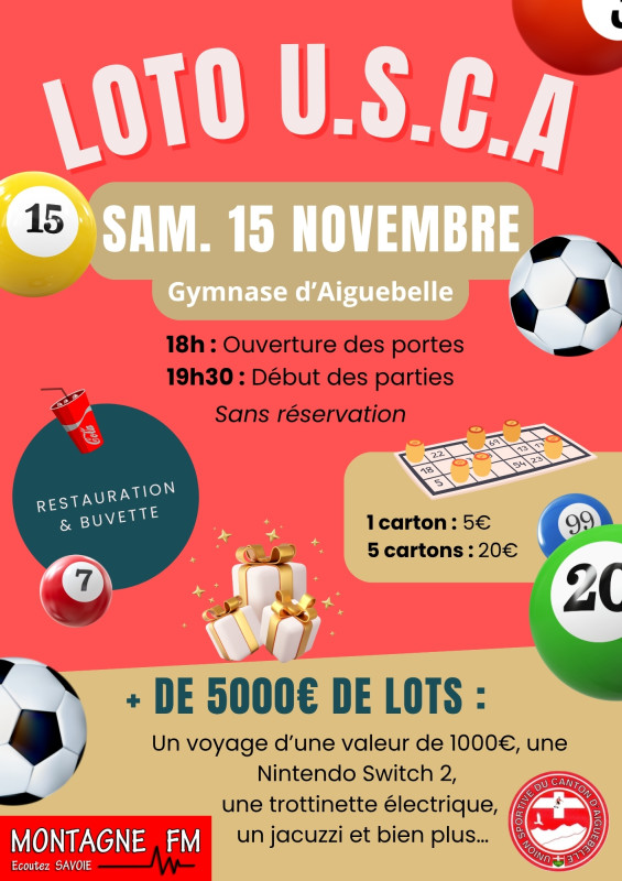 Loto organisé par le club de football U.S.C.Aiguebelle, le Samedi 15 Novembre 2025 au gymnase d'Aiguebelle.