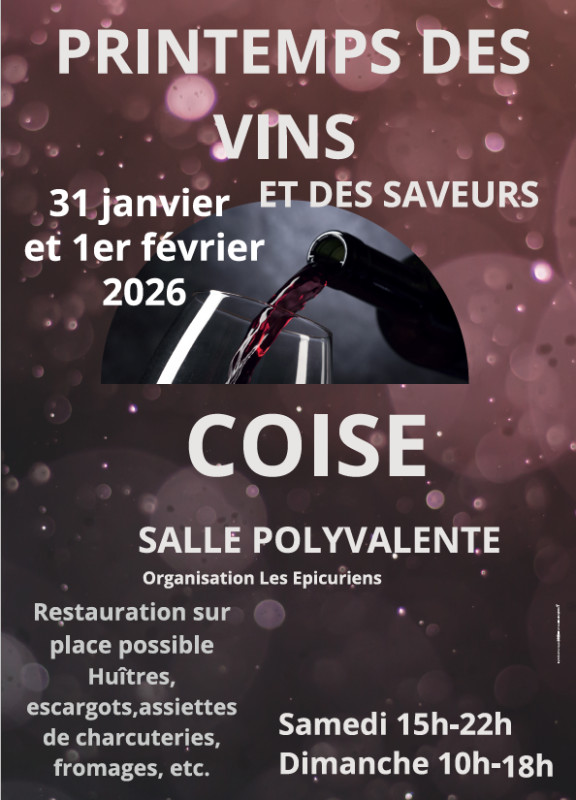 19ième salon des vins et saveurs du terroir à la salle polyvalente de Coise st Jean le samedi de 15 h à 22 h le dimanche de 10 h à 18 h. venez déguster sur place des huitres , escargots ,charcuterie , miel , safran charcuterie et de la patisserie accompagné d'une vintaine de producteurs de vins représentant la carte viticole Francaise . vous pouvez aussi participer à une tombola qui sera reversé dans sa totalité aux enfants en long séjour à l'hopital de Chambéry
