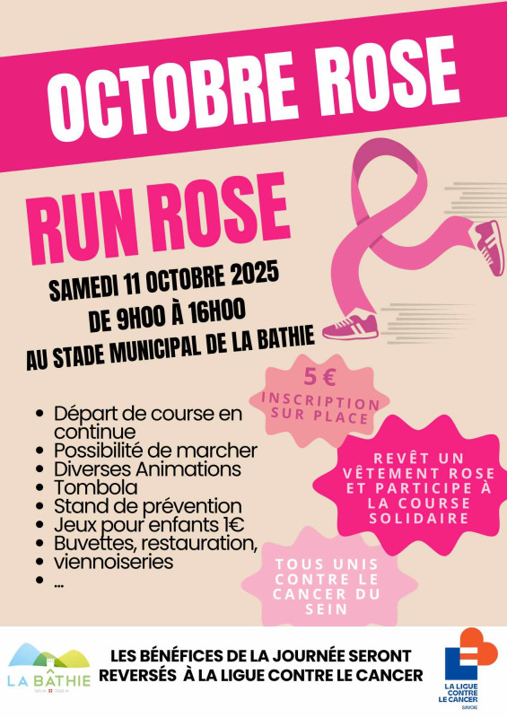 La Mairie de La Bathie et la Ligue du Cancer organise au stade de La Bathie des courses en continue autour du stade, possibilter de marcher. Il y aura pour les enfants des chasses aux rubans, course de cerceaux.