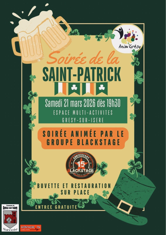 Anim'Grésy organise la fête de la Saint Patrick le 21 mars dès 19h30. Grésy-sur-Isère, Espace Multi-Activité.