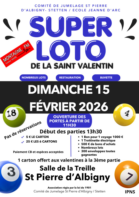 Le comité de jumelage de Saint Pierre d'Albigny/Stetten et l'Ecole Jeanne d'Arc organisent un Super LOTO de la Saint Valentin le dimanche 15 février 2026.