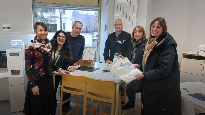 Depuis ce vendredi philatélistes et visiteurs s’intéressent à cette opportunité, et parmi eux l’Albertvilloise Aurélie Vibert, qui pose sur la photo en compagnie de (de g à d) : Sophie Lebeaupin, directrice du secteur Albertville, Maximiliana Perdono, chargée de clientèle, Philippe Duerbey, responsable d’exploitation, Frédéric Sadoux, responsable espace commercial et Isabelle Aguettaz, chargée de clientèle.