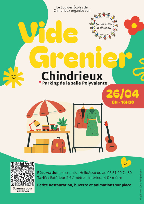 Le Sou des écoles de Chindrieux organise son grand vide-grenier ! Venez vendre, chiner et passer un moment convivial tout en soutenant les projets des enfants de l’école.