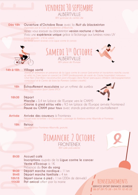 16h Échauffement musculaire sur un rythme de zumba Avec l’association Sport Santé EPGV. 16h30 Départ Marche : 3,4 km (place de l’Europe vers le CHAM) Course à pied et/ou vélo : 9,5 km (place de l’Europe arrivée Frontenex)