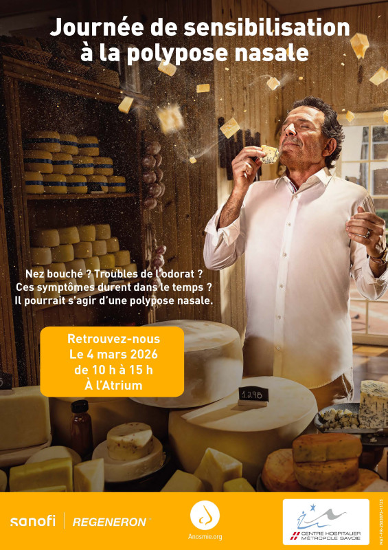 Le service d'ORL, et le laboratoire Sanofi Regeneron en partenariat avec anosmie.org, se mobilisent le mercredi 4 mars de 10h à 15h pour sensibiliser sur l'anosmie et la polypose nasale dans l'atrium de l'hôpital de Chambéry.