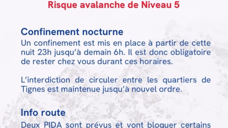 À partir de 23h cette nuit et jusqu’à 6h demain matin, la commune de Tignes met en place un confinement en raison du risque d’avalanche de niveau 5 qui touche la Tarentaise depuis ce matin.