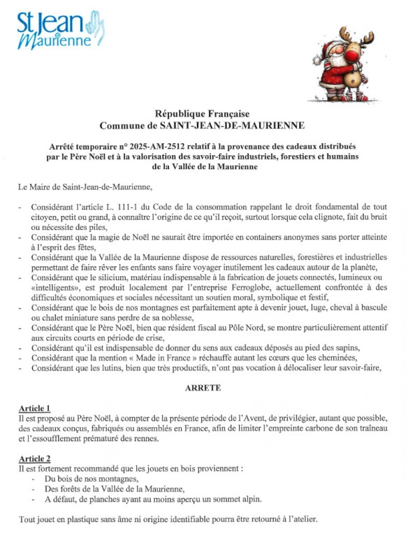 Dans un arrêté municipal volontairement humoristique, le maire Philippe Rollet invite le Père Noël à privilégier les cadeaux « conçus, fabriqués ou assemblés en France », et si possible en Maurienne.
