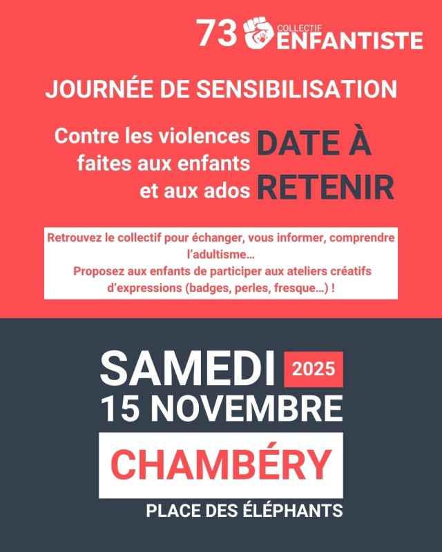Le samedi 15 novembre 2025, à partir de 14h, le Collectif Enfantiste 73 invite toutes et tous à se rassembler place des Éléphants à Chambéry pour une mobilisation citoyenne forte contre les violences faites aux enfants et aux adolescents.