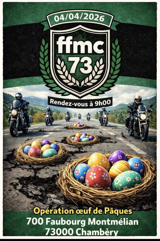 la ffmc, National (fédération française des motards en colères)et la mutuelle des motards organisent comme chaque année, une opération œuf de Pâques . Votre antenne 73 y participe , cela consiste à marquer de façon humoristique, l'état catastrophique de nos routes et ensuite de prévenir la mairie. Dans un but citoyen, car nous sommes tous concernés véhicules à moteur ou non et piéton.