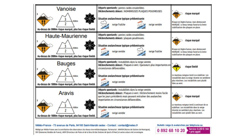 • Consulter les prévisions et bulletins avalanche de Météo-France.