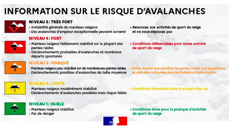 Une extrême vigilance est de rigueur pour la pratique de toutes les activités de montagne, et principalement pour les randonnées à ski ou en raquettes, quel que soit le niveau. Même si pelles, sondes et détecteurs de victimes d’avalanches sont indispensables, ces outils ne protègent aucunement du risque d’avalanche.
