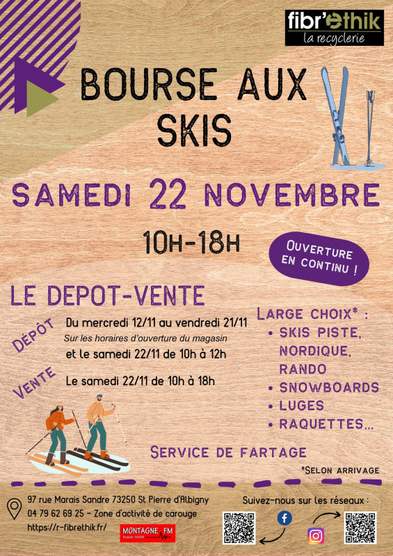 Le samedi 22 novembre 2025 la Recyclerie Fibr’Ethik organise sa bourse aux skis de 10h à 18h,